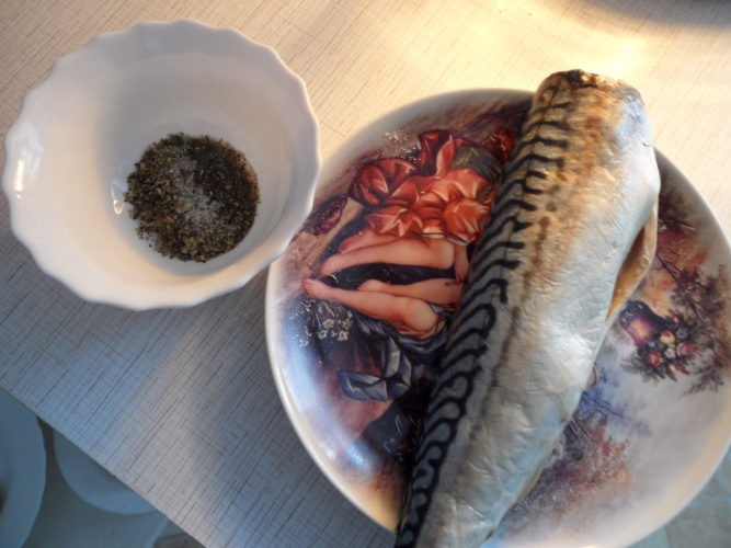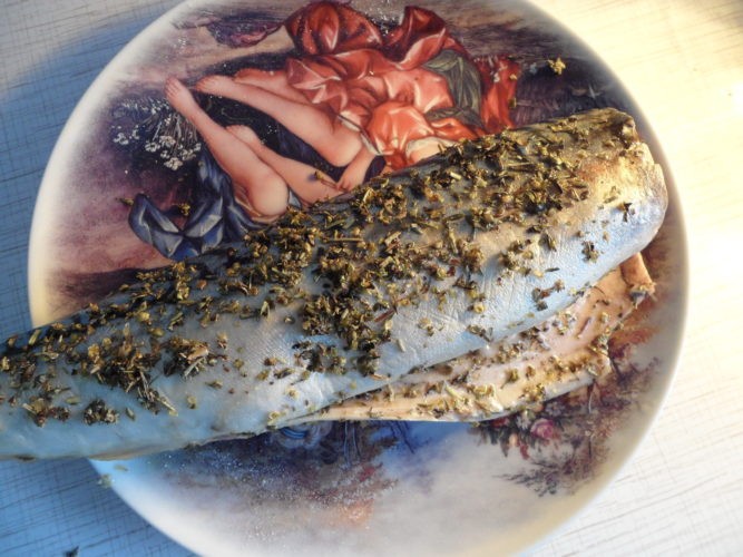 - Натираем ее любыми вашими любимыми травами. Я купила приправу «Итальянские травы», в составе орегано, базилик, майоран, розмарин, чабер, тимьян, шалфей. Для того, чтобы травы хорошо прилипали к скумбрии, добавьте 1 ст ложку растительного масла;